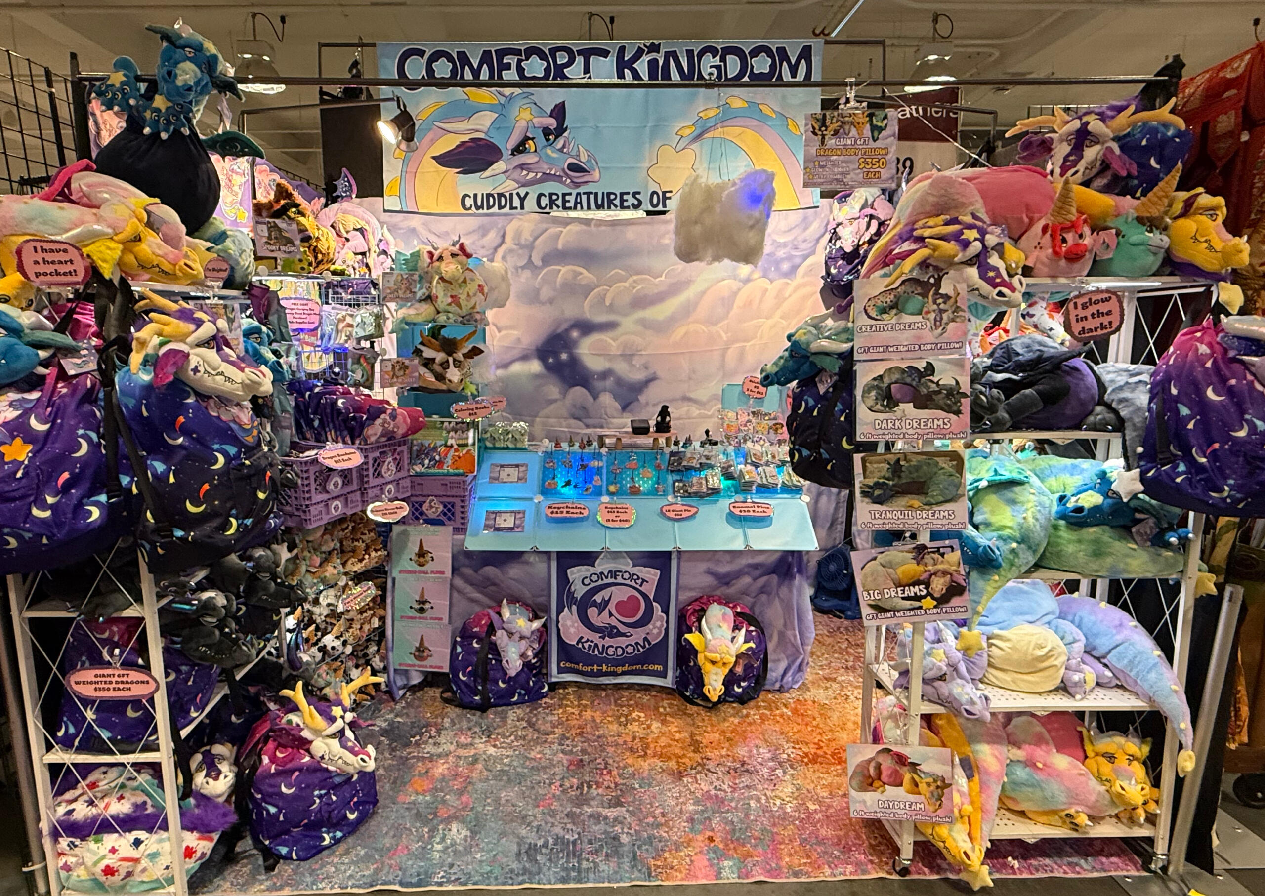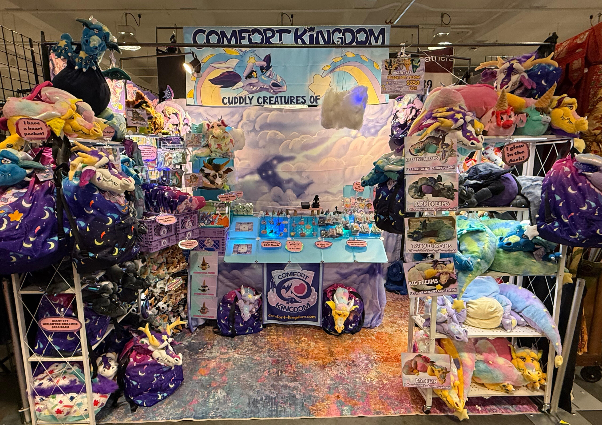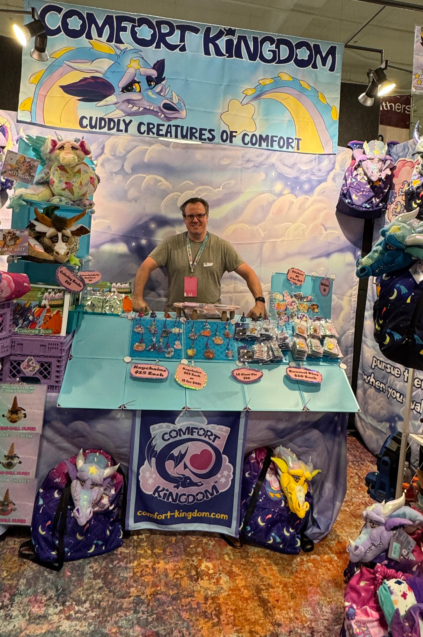 Hello, we are Comfort Kingdom, a couple of neurodivergent creators who seek to create an escape from the stresses of life.Our business is new, but we are experienced pros when it comes to conventions. Randall has a background building displays for retail stores as well as a long background working in logistics and warehousing. His partner is an agented licensed artist and designer, now represented by one of the top global licensing agencies “MGL Licensing” Together we have sold at more than hundreds of conventions with our other business for over a decade.We hope you will consider us for your show, so we can reach more people and make the world just a bit more comforting.
